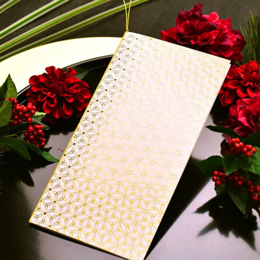 贅沢に広がる箔押しの伝統的な輪つなぎ模様が上品に輝きます