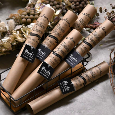 クラフトペーパーをくるくる巻いてお好みのタグやリボンで仕上げます