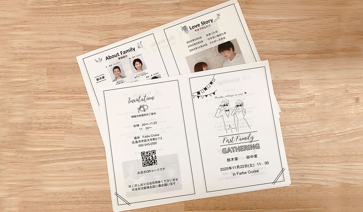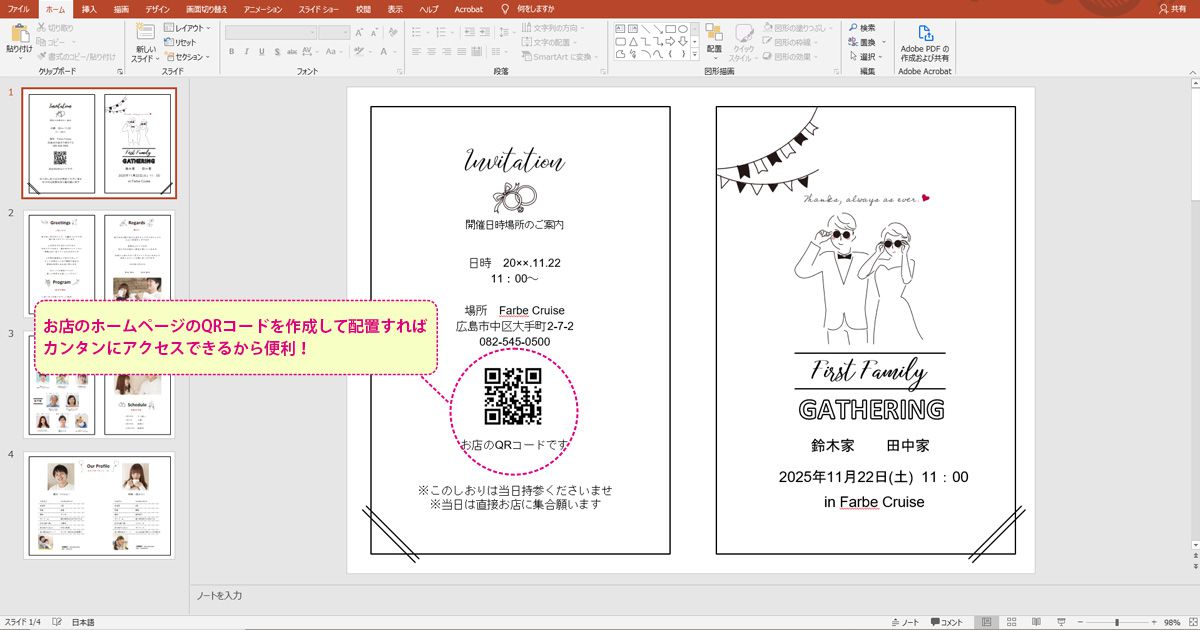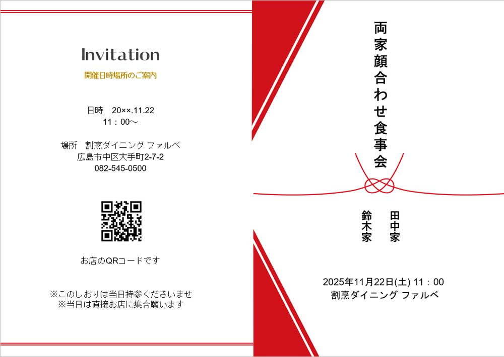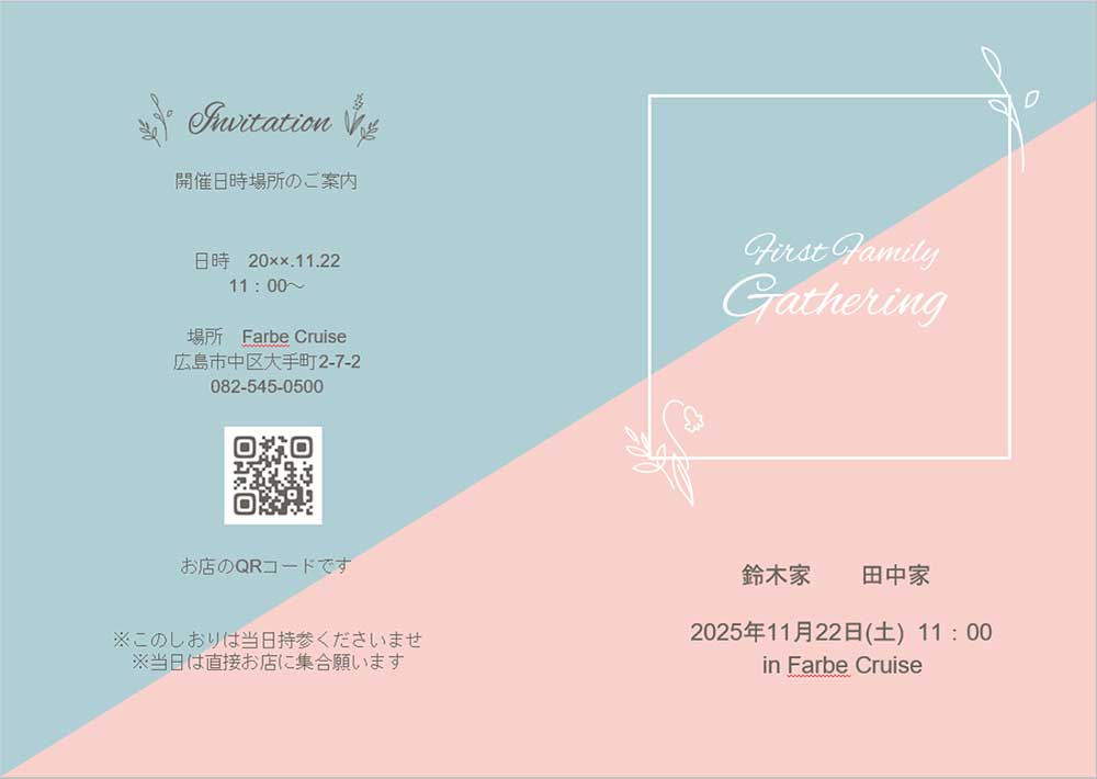 テキストを編集&画像を挿入して、顔合わせ会しおりのデータは完成です。裏面の招待状部分にはお店のホームページのQRコードを作成して配置すれば、簡単にアクセスできるから便利ですよ♪QRコードの作り方はネットで検索するとでてくるのでやってみてくださいね。