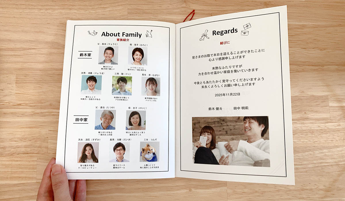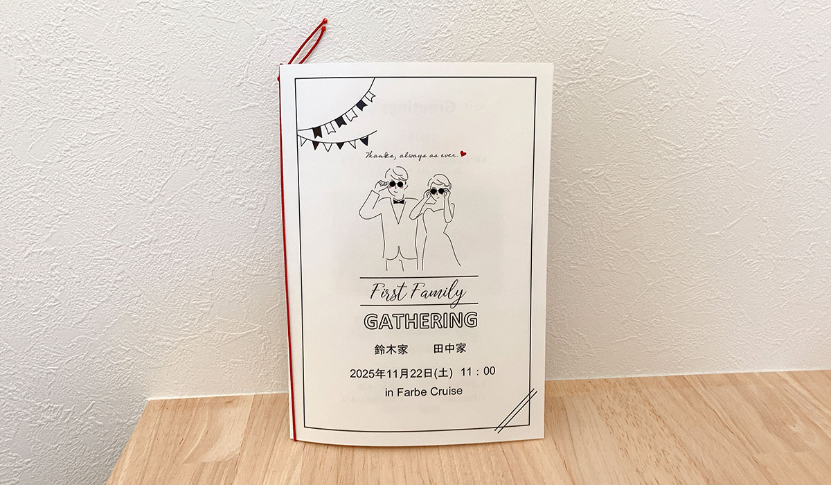 顔合わせ食事会で配るしおりといえば数年前から大人気の、今では準備するのがあたりまえのマストアイテム。親睦を深めるツールとして両家や両親を思って準備する気遣いからできたアイテムです。