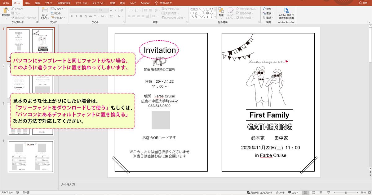 パソコンにテンプレートと同じフォントが存在しない場合、下記画像のように、見本と異なる見た目になってしまいます。