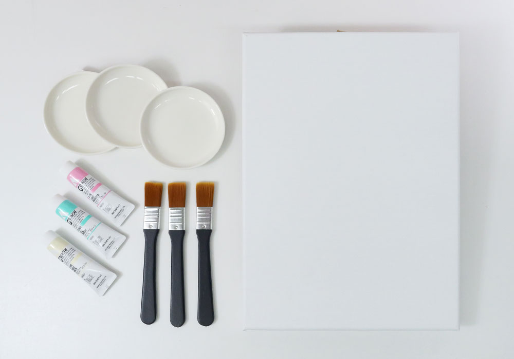 ウェディングキャンバスの必要な材料は下記の通り。手に入りにくい材料ではないので、自分たちで画材屋さんや小売店にいって必要なものを用意しましょ。
