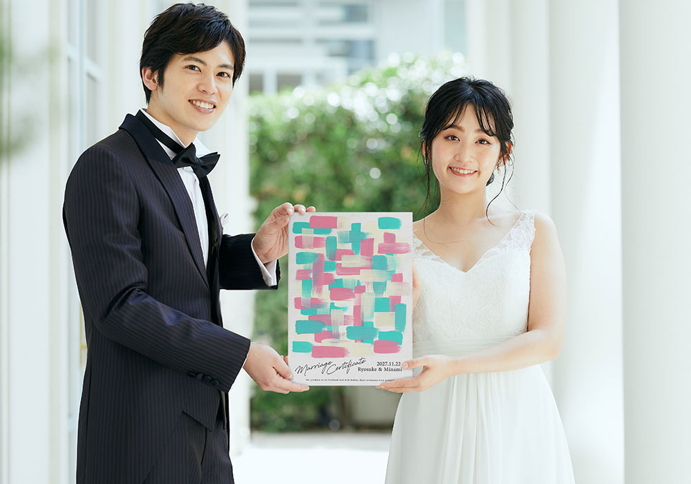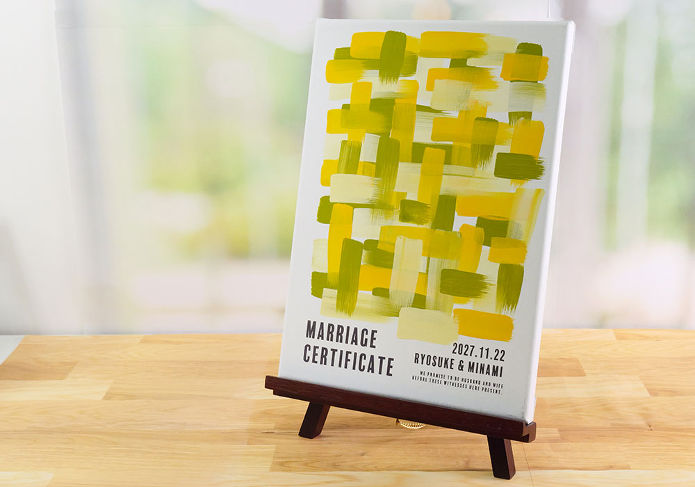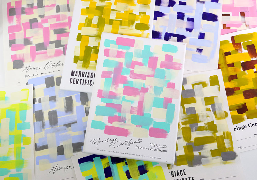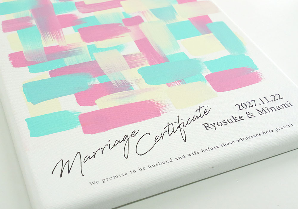 真っ白なキャンバスにゲストが一筆一筆描いて出来るから、世界に一つだけの結婚証明書になります。