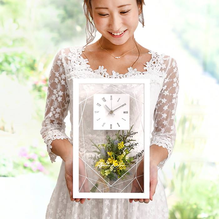 まるでありがとうの花束をとじこめたような花時計なら、ずっと枯れない花束をいつまでもそばに飾っていただけます。インテリアとしてもおしゃれなので、自分たちの新居+両実家に3家族お揃いの記念品にされる方も多いです。離れていても同じ時を過ごしている、そんな風に感じることができる時計は結婚の記念品にぴったり!