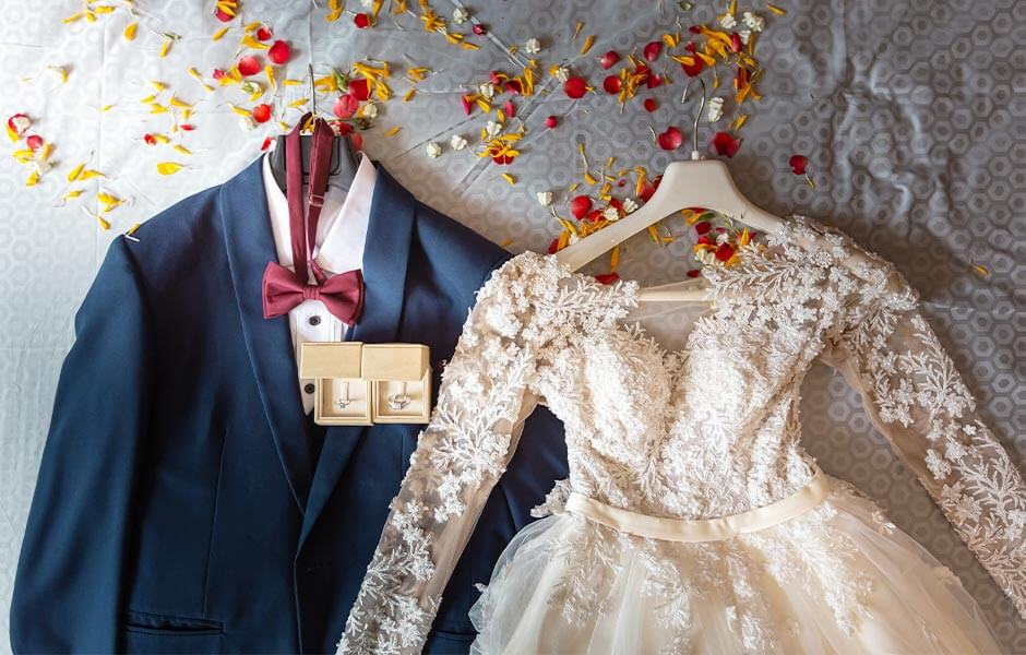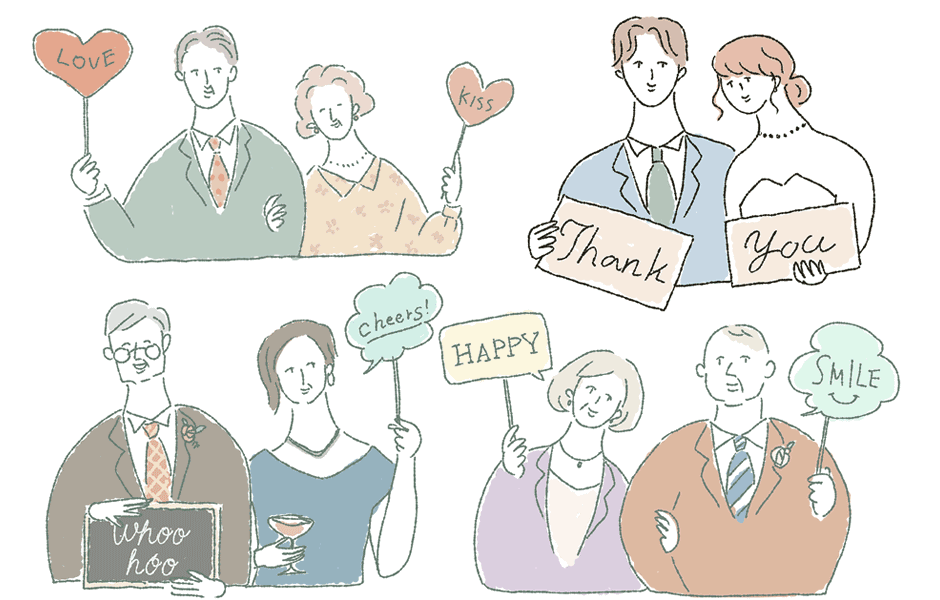 服装に関しても特に決まりはなく、お二人のお好みでOK。とはいえ結婚のお披露目の場なのであまりカジュアルすぎないのがおすすめです。スーツとワンピースなどセミフォーマルや、もちろんドレス&タキシードを着用するケースも多いです。