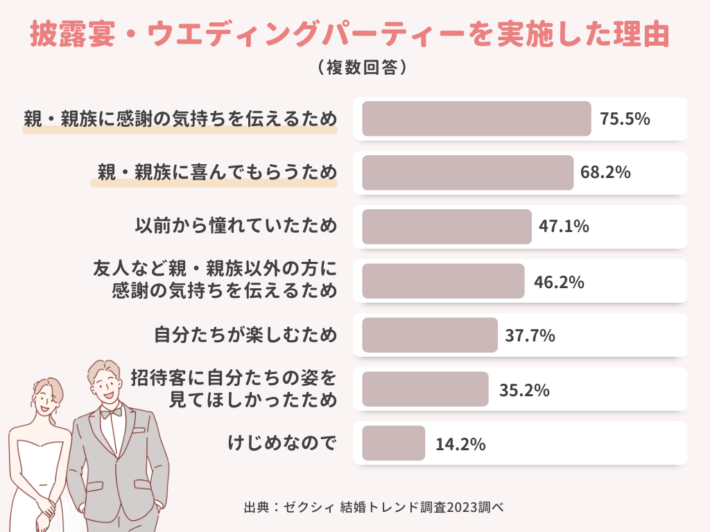 ゼクシィの調査によると、結婚式を開催した理由として「親・親族に感謝の気持ちを伝えるため」が75.5%、次いで「親・親族に喜んでもらうため」が68.2%、という回答がトップを占めています。(ゼクシィ結婚トレンド調査2023調べ)