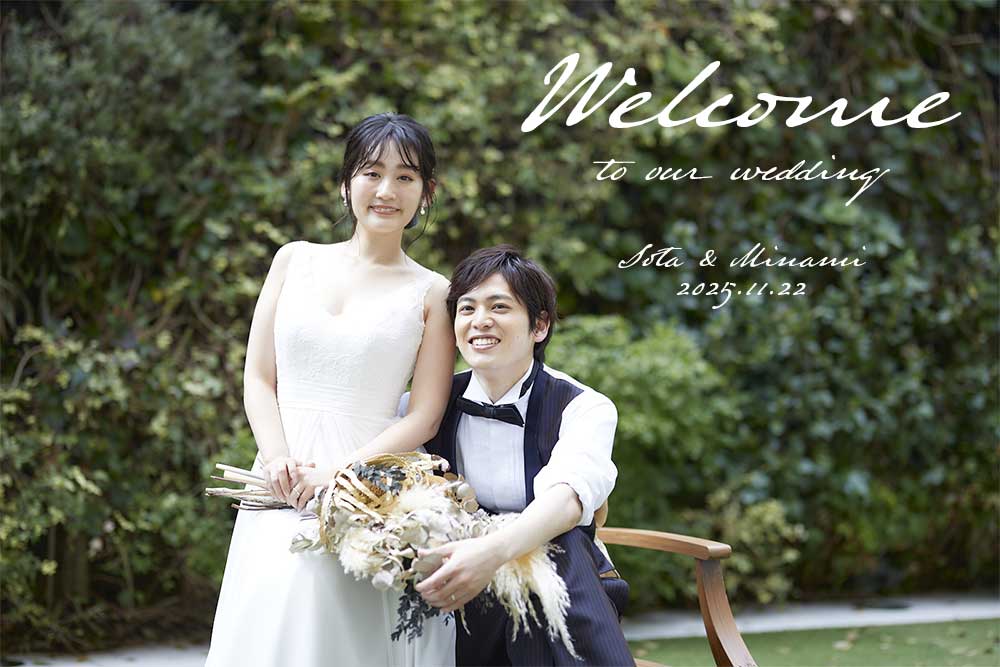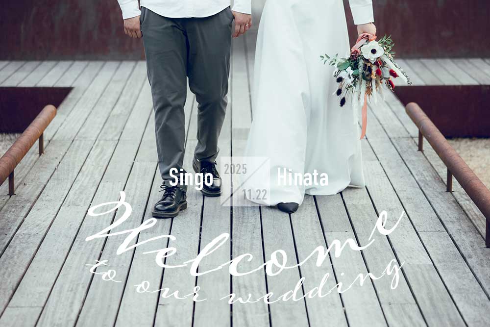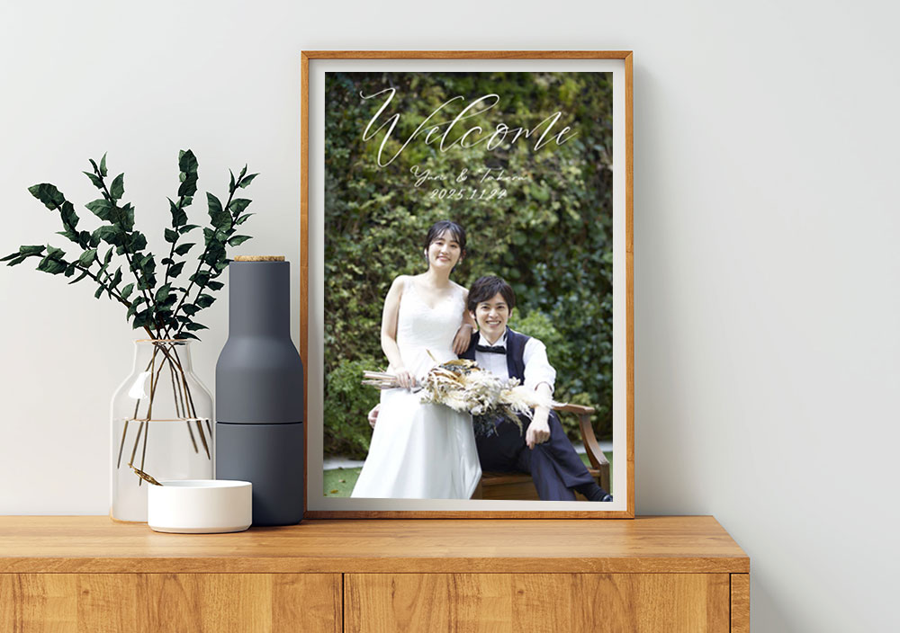 前撮りフォトやエンゲージメントフォト、とっておきの一枚で作る写真が主役のウェルカムボード。いただいたお写真データを使って「Welcome to our wedding」の英字、新郎新婦様のお名前&挙式日をおしゃれに配置します。