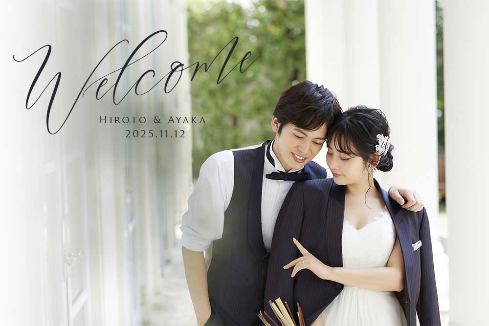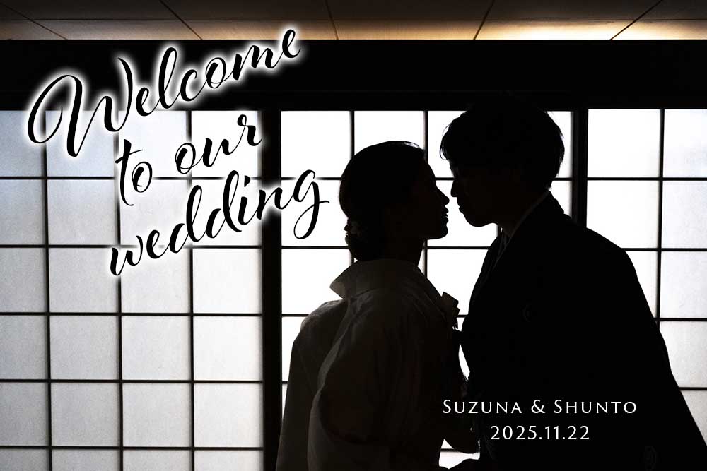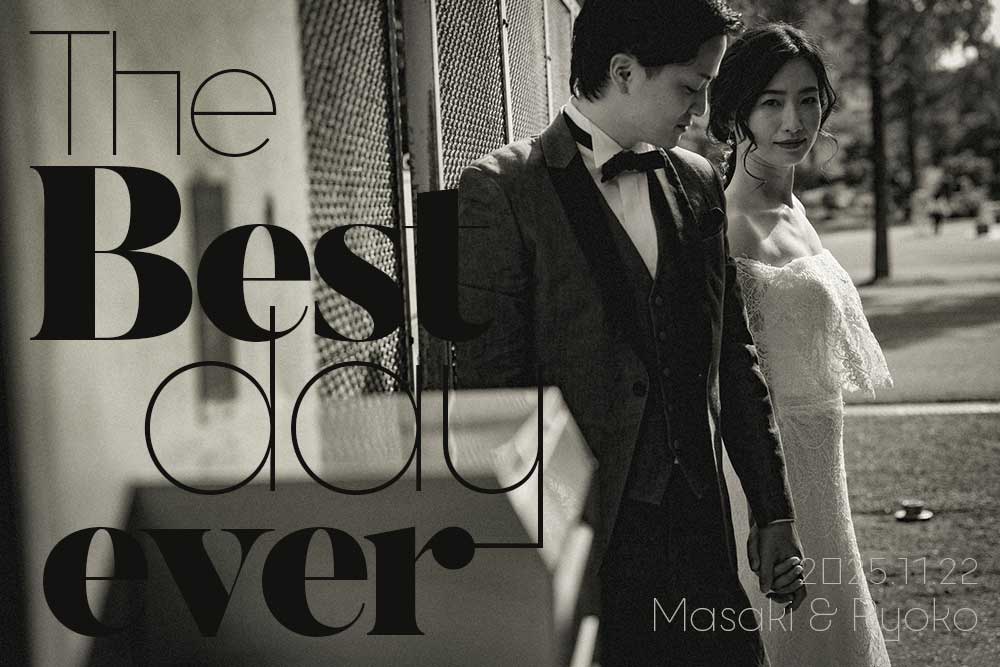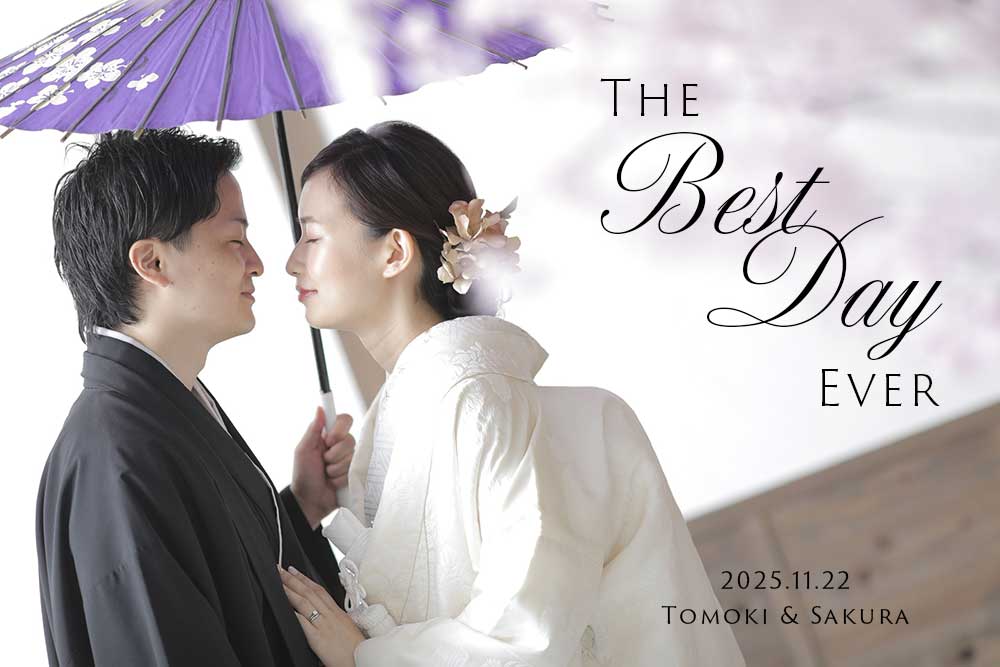 和装の前撮り写真をウェルカムボードにする方も多いです。こちらも2種類のフォントを組み合わせていますが、上品で高級感のある雰囲気を意識してレイアウトしています。「Welcome」「Welcome to our wedding」という定番のウェルカムボードタイトル以外にも「The best day ever」という言い回しもオススメ!