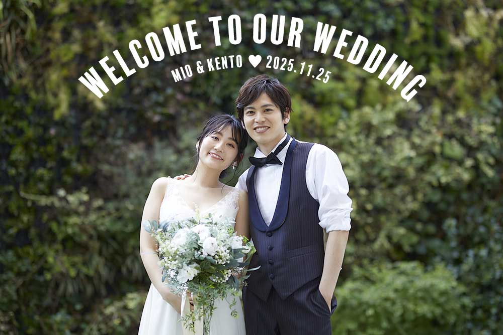 下側に余白のある写真だったので、そこにアーチ型テキストを配置しました。こんな風にお顔を出さない写真を使うと、ポスターみたいになってスタイリッシュで素敵です!挙式後にお部屋に飾るのもあんまり恥ずかしくないかもしれませんね。