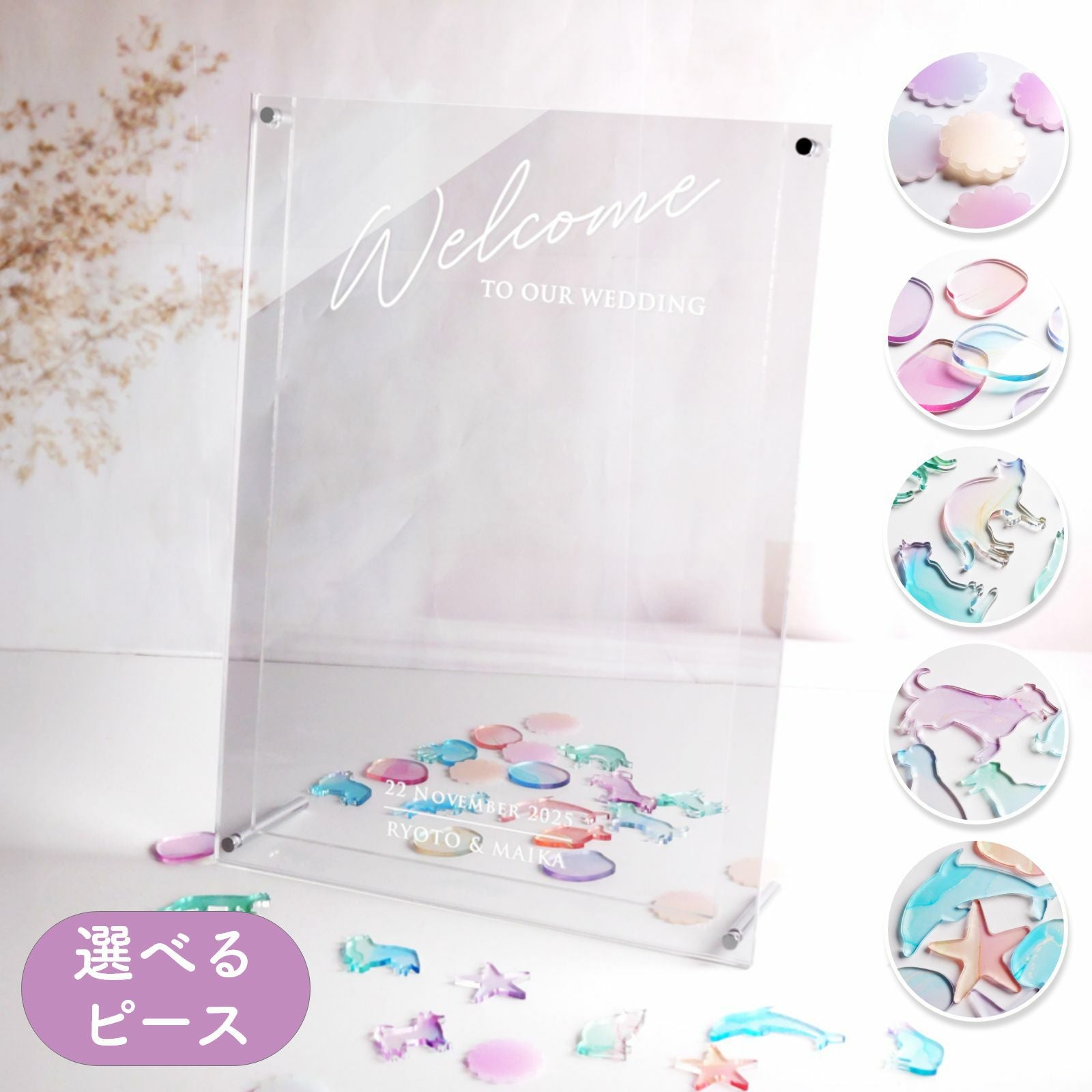 まるでアート!おしゃれな切り抜き写真のウェルカムボード。写真を送るだけで、あとはデザイナーがお写真をトリミングして美しくレイアウトしてくれるのもうれしいポイントです。