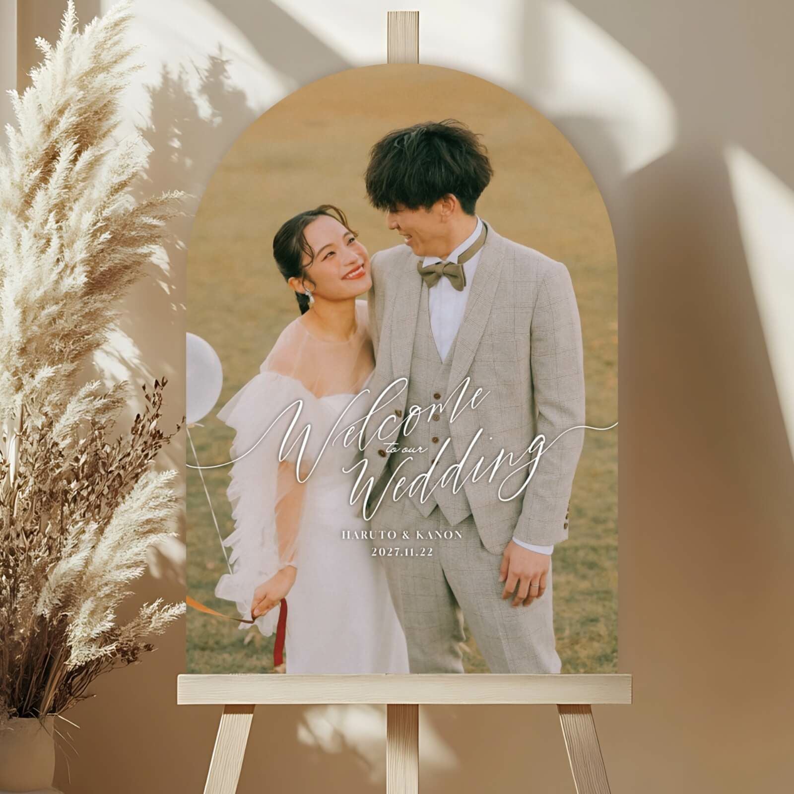 光沢紙に色鮮やかに印刷するフォトパネルタイプのウェルカムボード。軽量な白パネル仕上げなので、持ち運びや設置も簡単。アーチ型の窓のむこうに二人がいるような奥行き感を感じるデザインレイアウトもおしゃれ!