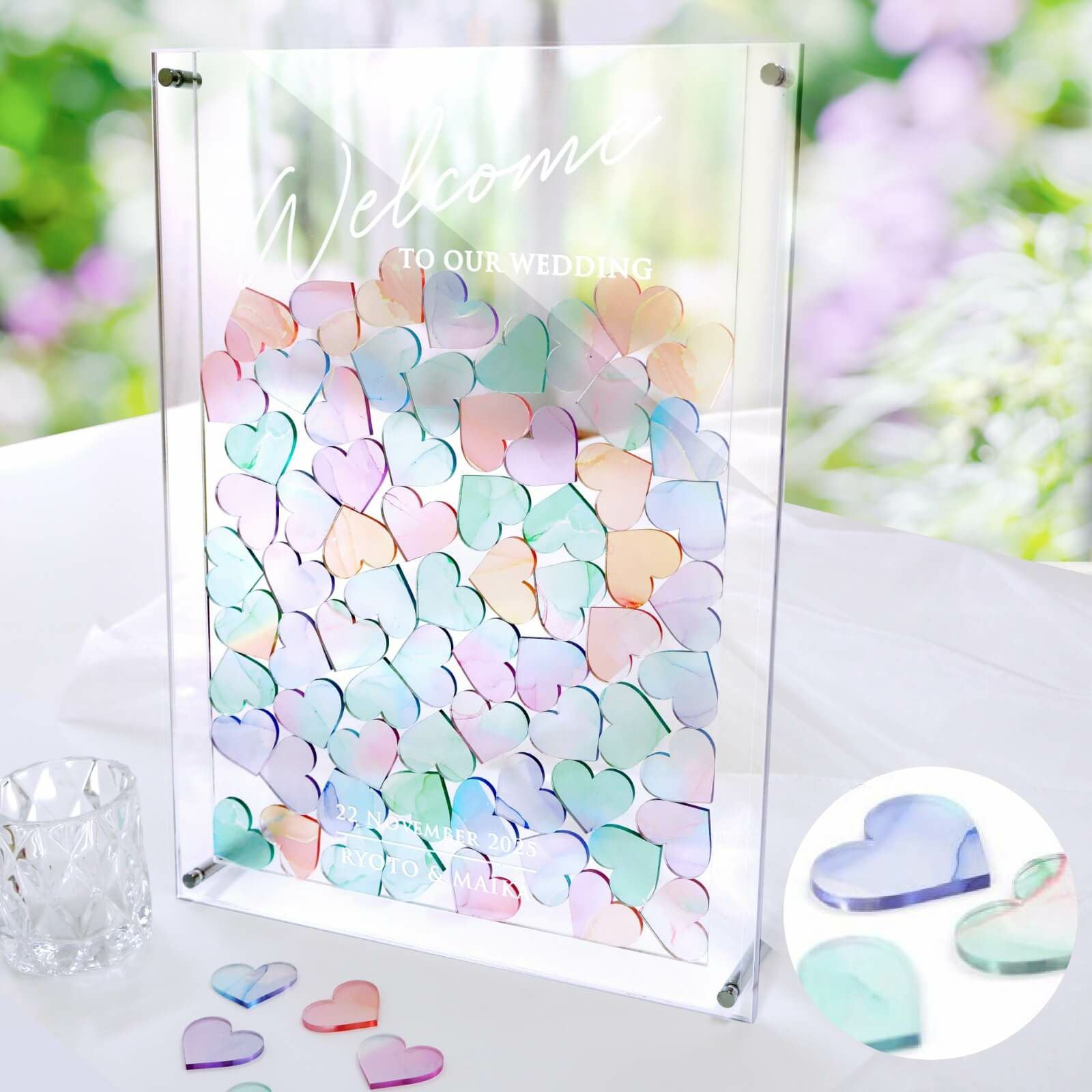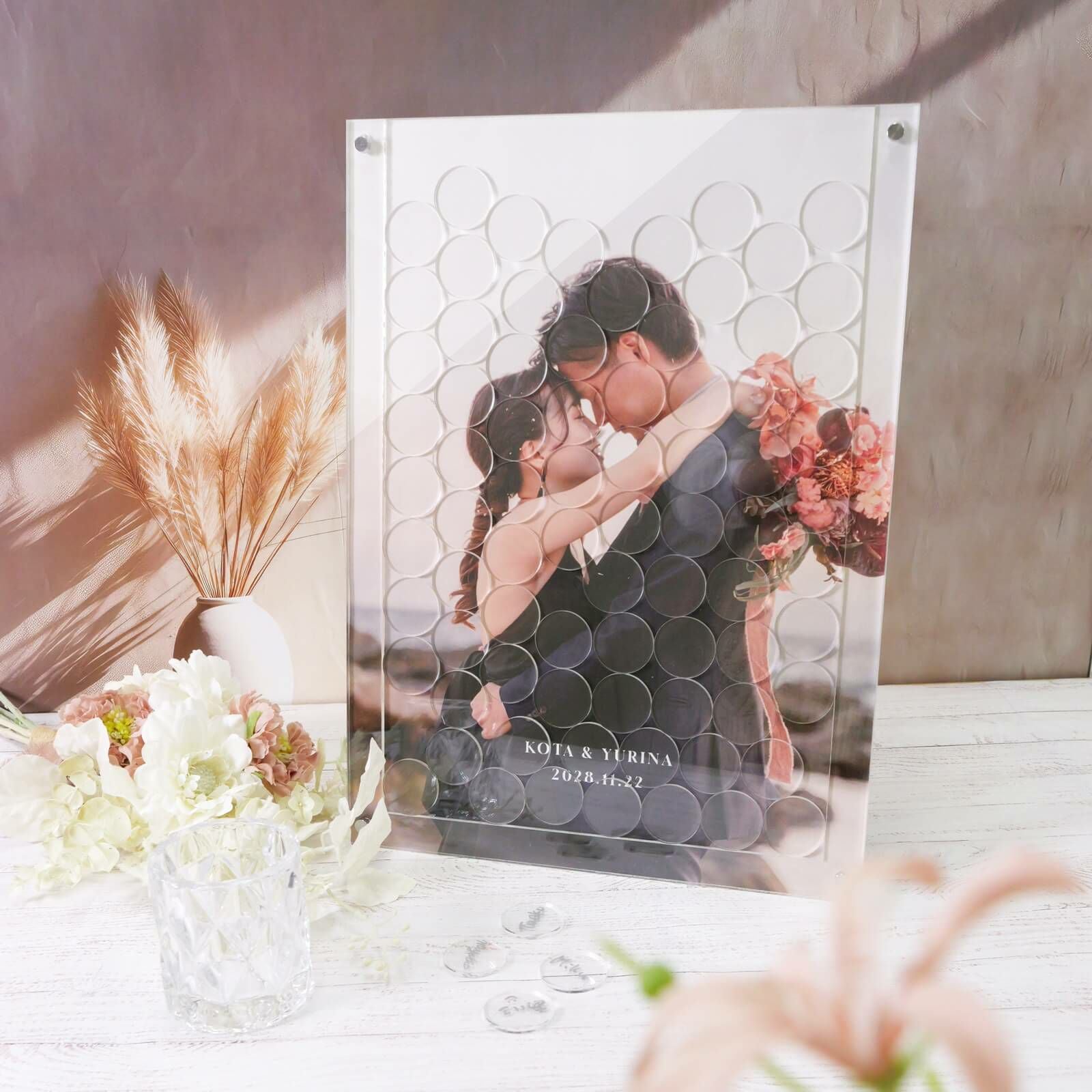 今トレンドなのがゲスト参加型の演出「ウェディングドロップス」。おしゃれなビジュでウェルカムスペースに映えるだけでなく、結婚の承認をしてもらう結婚証明書になったり、チップにサインしてもらって芳名帳の代わりにもなったりと、大活躍のスグレモノ。しかも、式後は新居のインテリアとしてずーっと飾れます♡