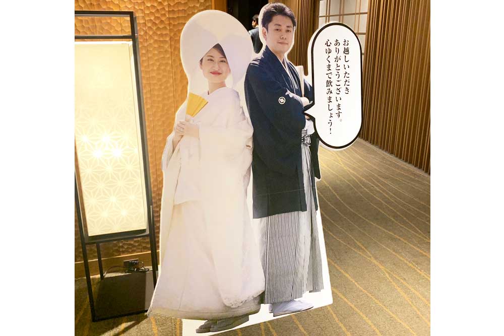 新郎新婦の等身大パネルは、ゲストにとって絶好のフォトスポットに!受付で新郎新婦がお出迎えをするのは難しいので、その代わりにこのパネルでお出迎えすれば、ゲストも喜んでくれそうです。