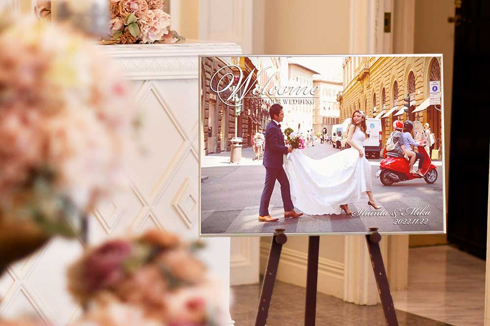 当日は、新郎新婦がゲストを入口で待ち構えて「今日はお越しいただいてありがとうございます」と出迎えることが難しいですよね。ですが、お二人の写真やゲストとの思い出の写真を使って、ゲストに「ようこそ!」「今日は楽しんで帰ってくださいね」という気持ちを伝えることはできるはず。