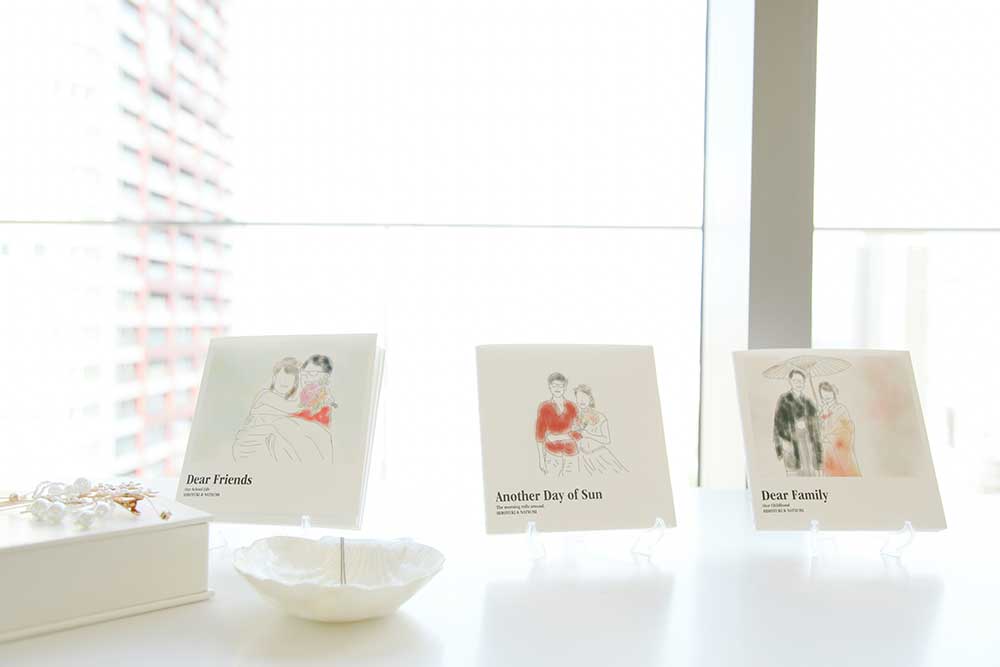 写真の代わりに、人気の線画イラストを写真のように飾るアイデアもオシャレで素敵!最近は線画イラストをウェディングアイテムに取り入れる方も多いので、こんな風にウェルカムスペースを飾る演出に取り入れるのもイマドキかも!