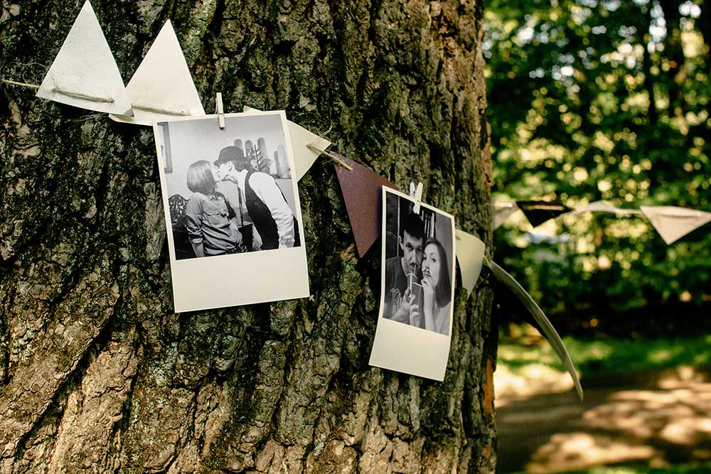 大きなシンボルツリーに写真を吊るすアイデア。木の枝にお写真がなっているような素敵なデコレーションです。これはインパクトもあり、ウェルカムスペースを華やかに彩ってくれそう。