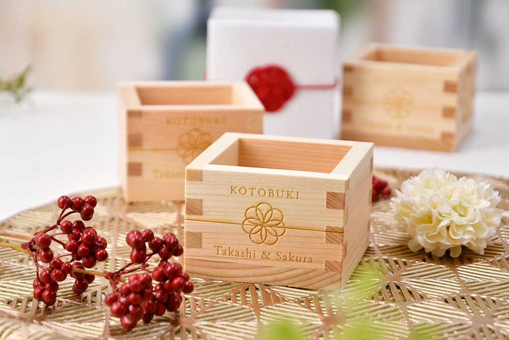 愛が増す、幸せが増す、言葉の響きから縁起がいいと言われている「枡(ます)」のギフト。ご両家が初めて顔をあわせる会の記念の品としてぴったりな縁起物。ちょっとした小物入れや食器として使える実用性も魅力です。