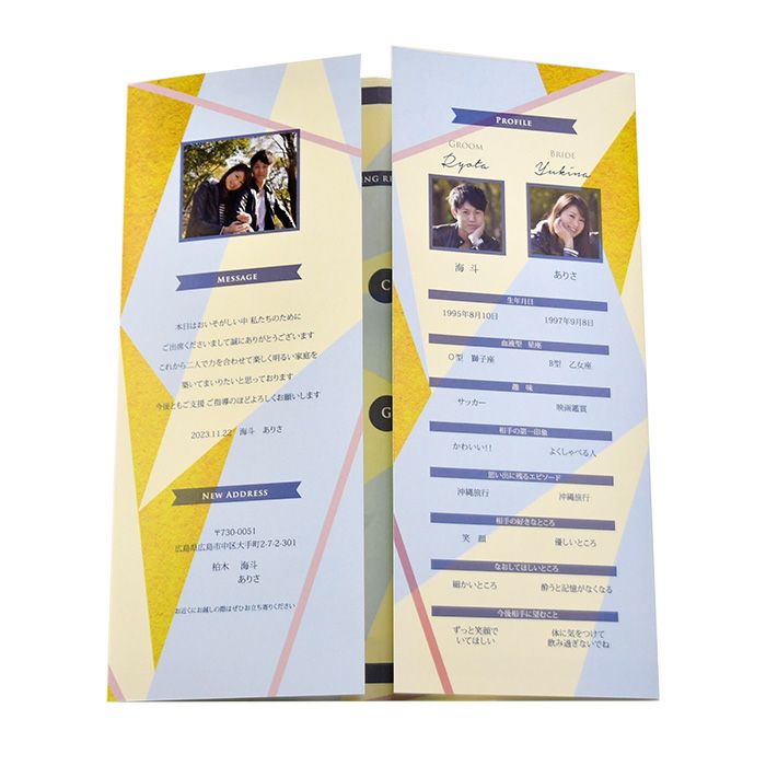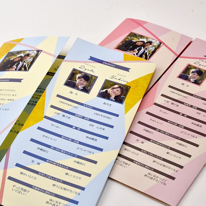 他の画像を見る 席次表付プロフィールブック「Melinda メリンダ」10部セット 販売価格 ¥ 26,400 税込 〜 販売価格 ¥ 税込 商品について 閉じる 写真をたっぷりお披露目できる席次表付きプロフィールブック。全8ページからなる充実の内容で、あいさつ文、メニュー、席次表、二人のプロフィール、フォトギャラリーと欲しい内容が全部つまった一冊に仕上がります。 詳細を見る お気に入り登録