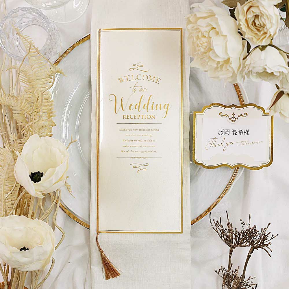 他の画像を見る 入力印刷付き 「カミーユ」席次表完成品オーダー(入力印刷込) 定価 ¥ 880 のところ 販売価格 ¥ 770 税込 商品について 閉じる ゴールドの箔押しを贅沢にあしらいながらもぬくもりのあるアイボリーカラーの台紙が優しく調和。エレガントかつ上品なデザインで、結婚式にふさわしい華やかさと高級感を兼ね備えた席次表です。 詳細を見る お気に入り登録