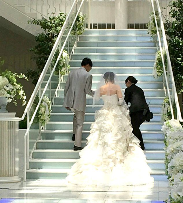 ウェディングドレスにもこだわったそうで、式場に合わせて後ろが長めのタイプに。階段でとてもキレイに映えていてとっても素敵なお写真です♡
