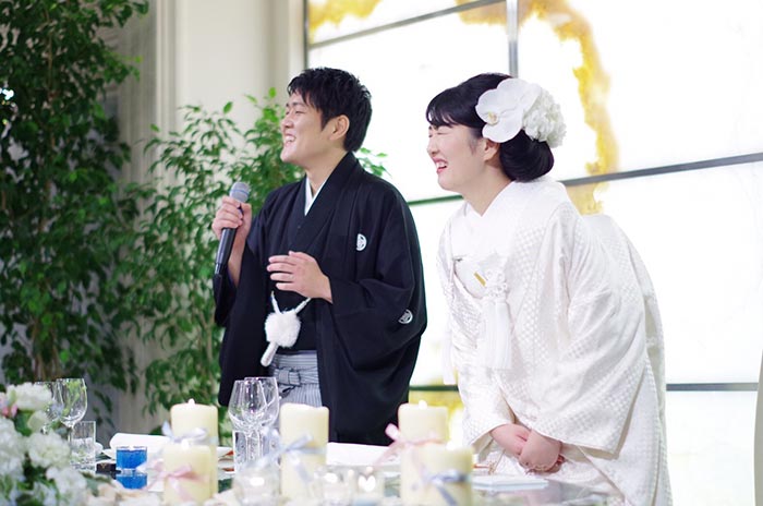 こちらはウェルカムスピーチでのひとコマ。打ち合わせがあまり出来ず、緊張もあってうまく話せなかったという新郎さま。ゲストが笑ってくれて空気もなごやかになったそう。