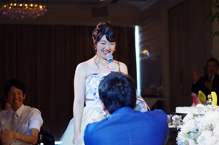 余興をお願いしなかった代わりに再入場でアナと雪の女王の「とびら開けて」を新郎と歌いながら入場しました。何度も練習を重ねたにも関わらず緊張してしまいましたが、ゲストから歓声が挙がり、やってよかったなと思いました。とKさま。