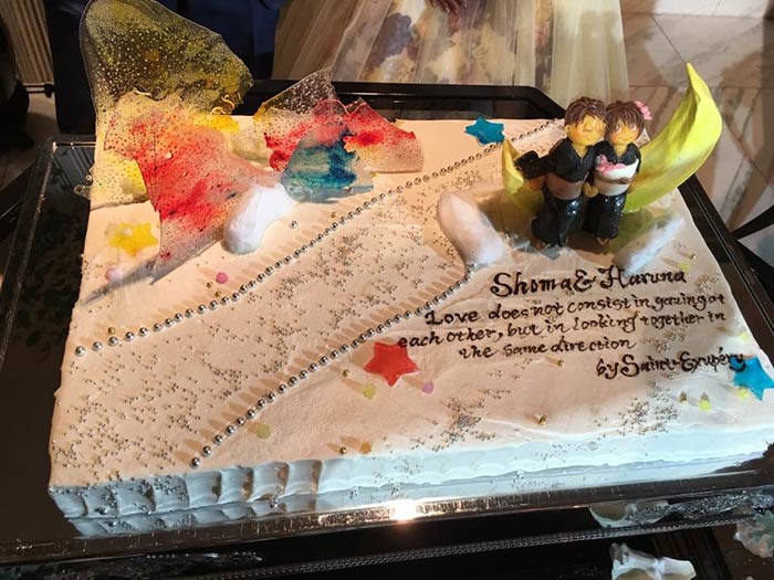 ケーキも花火と夜空をイメージ。「とっても可愛い仕上がりで思わず笑顔になりました」とKさま。花火の表現がとっても幻想的でうっとり。ちりばめられた星と月もお二人を祝福しているみたいですね♡
