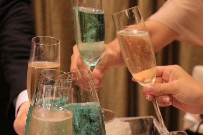 イニシャルオブジェも新郎新婦で色分けされたアレンジがされているし、こちら、乾杯酒もピンクと水色の2色に。
