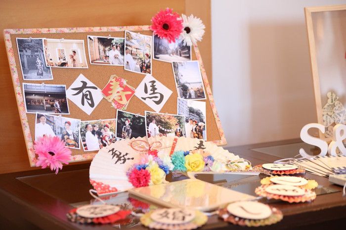 受付横の和装前撮りコーナーのアイテムはすべて手作りされ、新郎さんの大好きなアニメのキャラクターを並べたりと工夫して、ゲストのみなさんも楽しんでいただけたようです。