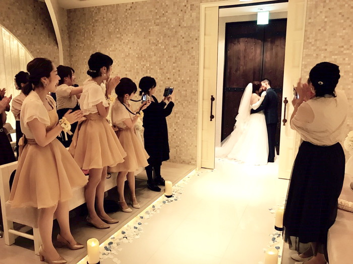 クロージングキス♡です。クロージングキスとはその名の通り、チャペルの扉が閉まるその瞬間に、新郎新婦のふたりがキスをするという演出です。まるで映画の世界!
