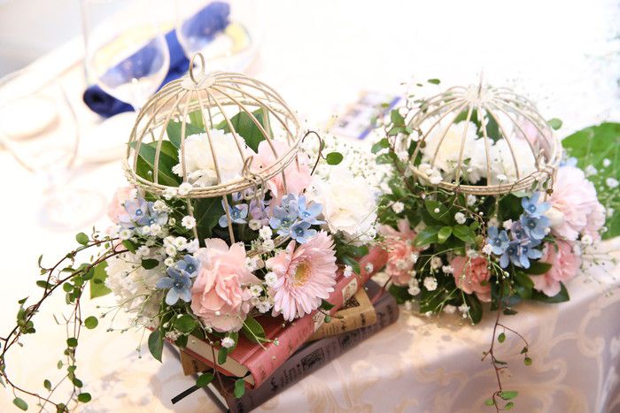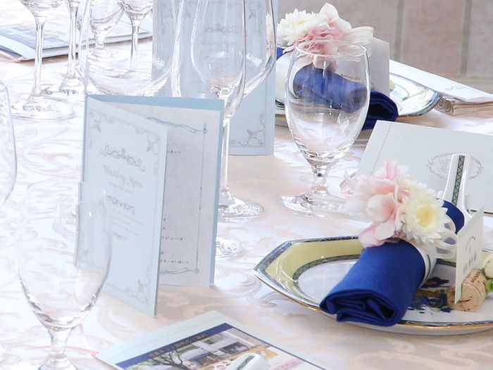 テーマカラーはパステルっぽい感じのピンクと水色に。テーブルコーディネートもテーマ通りパステル調で爽やかな雰囲気に♡