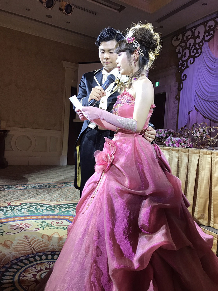 ミッキーをかたどったキャンドルでのキャンドルサービス。S様がお色直しに選ばれたのはピンクのドレス。ご友人からは意外だった!と言われたそうです。その意外性もまたウェディングの楽しみのひとつ。とーってもお似合いです♡