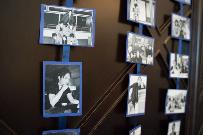 ロビーは、テーマをモチーフにしたタペストリーと、物語が書かれたブルーのランナーをアクセントに。壁一面に飾った写真は、あえてふたりの写真ではなく、ゲストが楽しめるようにゲストの懐かしの写真をオシャレに飾られました。