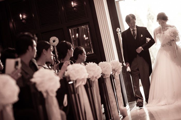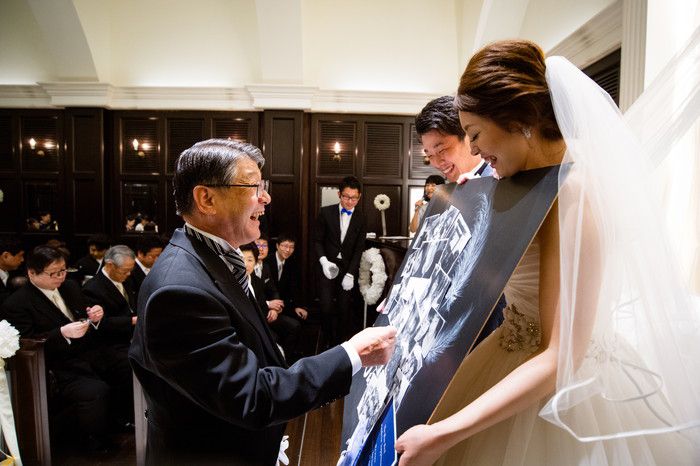 なんと新婦様が入場される前に、サプライズでお父様へ溢れる想いをムービーで伝え、ふたりで涙しながらバージンロードを歩いたそうです。