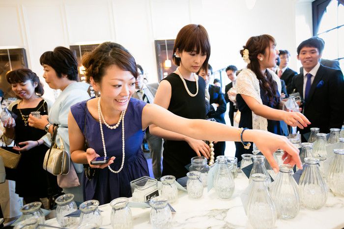 メイン席は、ソファーにしてゲストとの距離を縮め、ゲストテーブルは、ゲストがフラワーブッフェで選んだ花を飾って完成するという少し変わった演出も取り入れたそう。フラワーブッフェの小瓶には、それぞれゲストへのメッセージと写真を添えて、そのまま持ち帰れるように。花を選べる演出は、女性ゲストにとても好評だったそうです♡