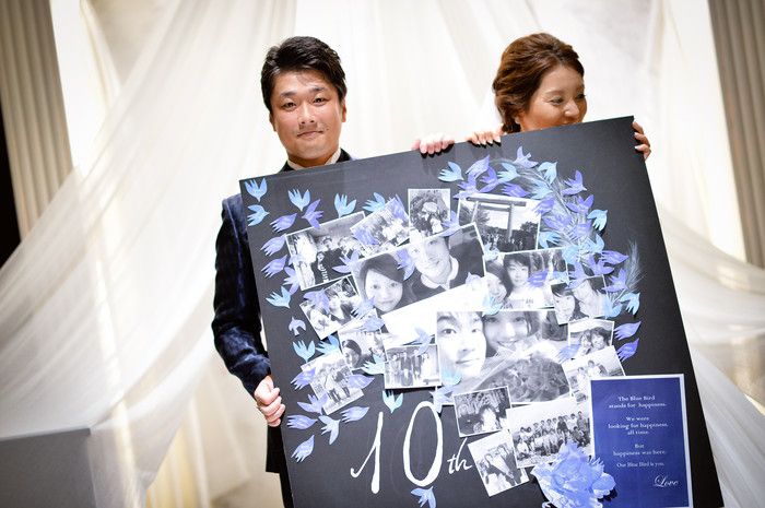 出逢って10年目でご結婚をされたおふたり。童話の青い鳥にちなんで、「自分達にとって、幸せを運んでくれる青い鳥はお互いであり、今まで見守ってくれた大切なゲストの人達」という思いを込めて、テーマは『the blue bird is you』にされたそう。ゲストのドレスコードもブルーに。