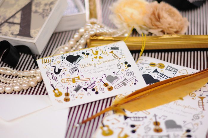 ピアノ・ヴァイオリン・トランペット、音楽にまつわるたくさんのモチーフをあしらったデザインの招待状。幸せを奏でてくれそう♡