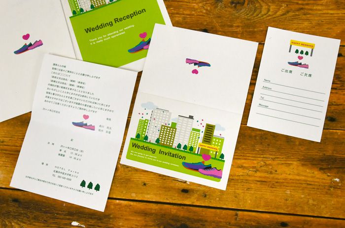 走ることが好きなお二人ならコレ!マラソン、ランニングをモチーフにした招待状。シューズの色の変更も可能。