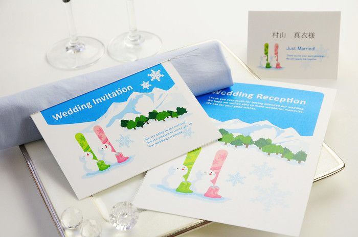冬のスポーツといえばスノーボード。雪山に新郎新婦をイメージした雪だるまが可愛くあしらわれています。