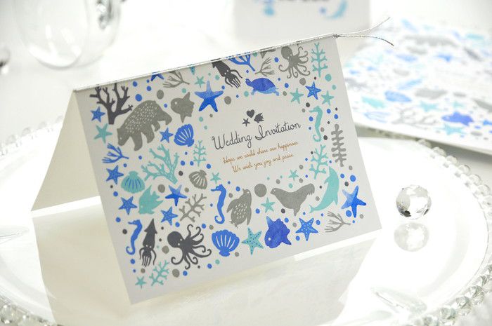 初めていったデートが水族館!?なんて方はこちらはいかが?水辺の動物や植物をあしらった涼しげなデザインの招待状。