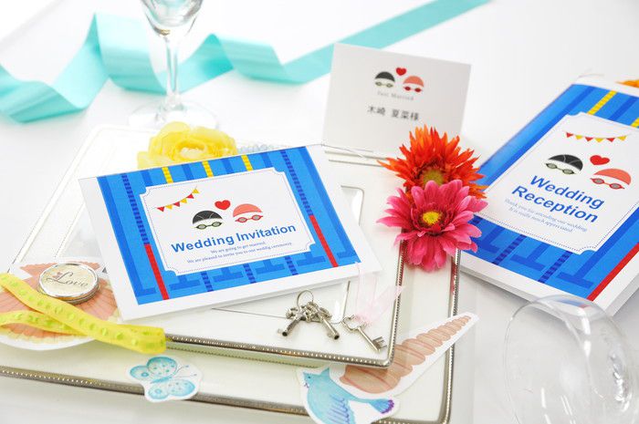 アクティブな二人にぴったりの元気カラー。スイミングプールと水泳帽&ゴーグルのイラストをモチーフにしたスイミング招待状