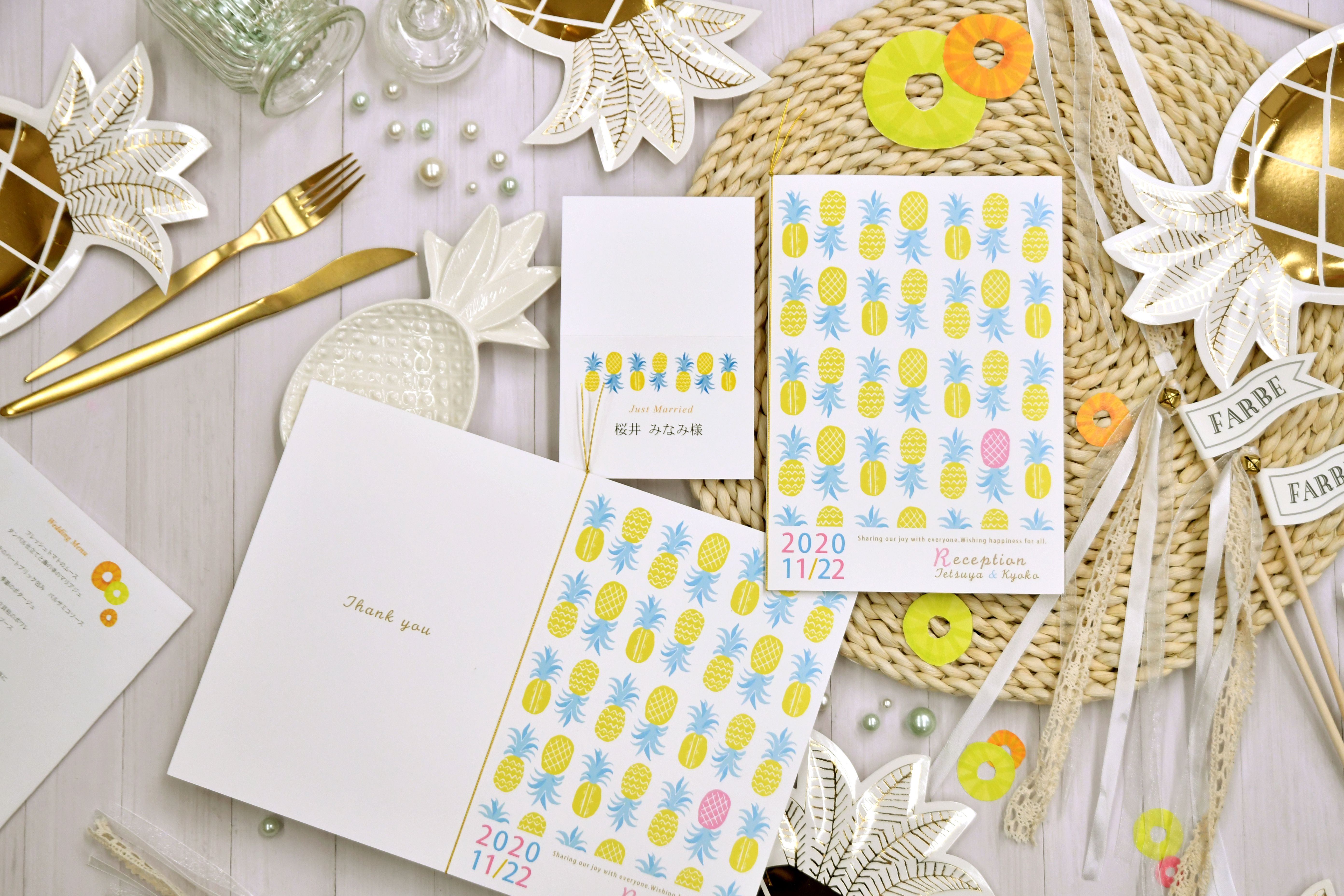 おもてなしの象徴パイナップルイラストがCUTE!トロピカルウェディングにもぴったりの招待状。こんな招待状が届いたらゲストもHAPPYな気持ちになるはず♡