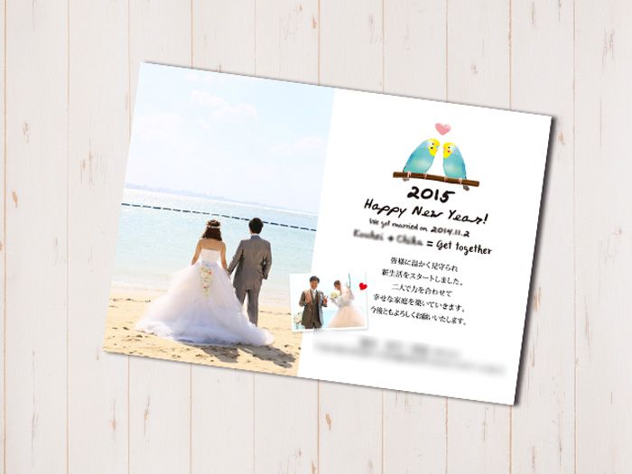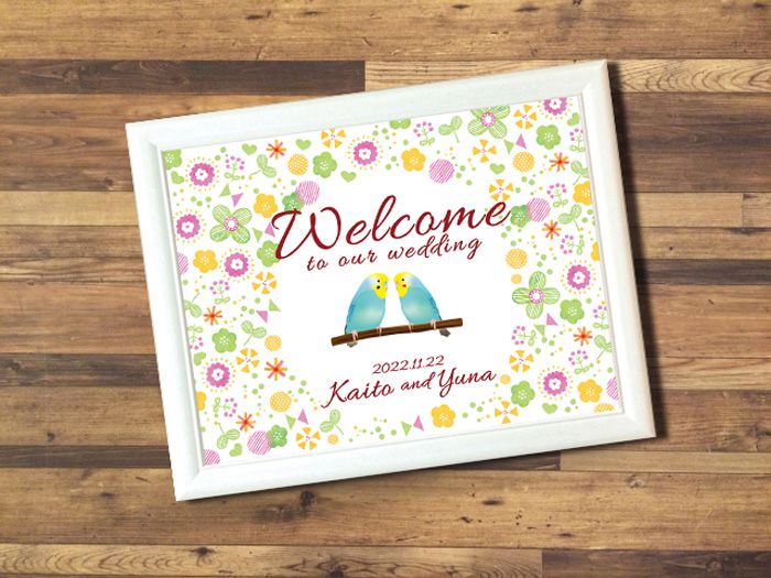 セキセイインコをテーマに結婚式をするなら、結婚の報告も同じデザインで。最後までぬかりなく好きを表現しよう♡