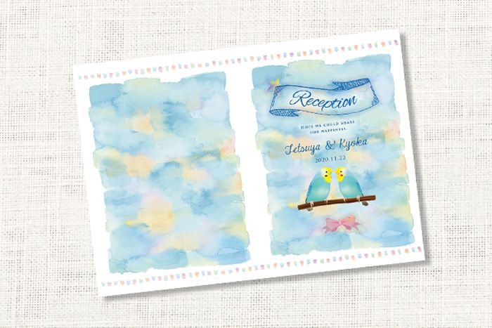 淡いブルーの水彩デザインの中に2羽のインコが可愛く並んでいます。お二人のお名前と挙式日入りの特別仕様。こちらはご要望に応じてオリジナルで作ったインコ席次表。ご注文後作るアイテムだから背景の水彩の色やインコの色も変更可能みたい。