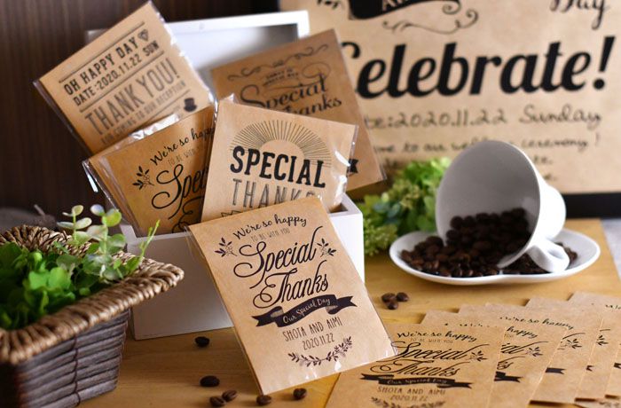 オシャレなラッピングセットを利用して、お気に入りの紅茶を入れてオリジナルギフトを作ってみては。クラフト紙にお名前&挙式日をプリントできるデザインシートと、小袋、封シールをまとめた便利なセットを用意しています。