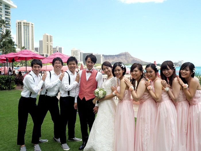 挙式にはお友達も参加され、ブライズメイド アッシャーを務められました。ロイヤルハワイアンホテルガーデンで撮られた写真は、新郎新婦はもちろん、参加した全員が笑顔あふれる、とっても素敵な1枚♡