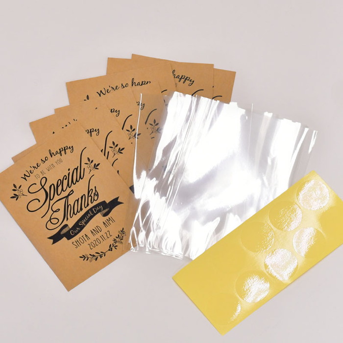 手作りはお二人の想いを伝えられる一番のアイテム。でもゲスト全員分をそろえるのはなかなか大変です。そこでおすすめなのがパッケージをオリジナルにする方法。ファルベでは、デザインシートと小袋、封シールのセットをご用意。お名前&挙式日入りデザインシートでおしゃれにオリジナル感を演出できます。コーヒーや紅茶、入浴剤、クッキーなど平らなものがオススメです。