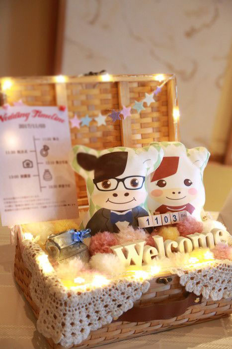 愛らしい表情がとっても素敵!!こちらのウェルカムトランクの牛さんクッションは、なんとアイロンプリントを利用してDIYされたそう。手作りとは思えない、完成度の高さです。