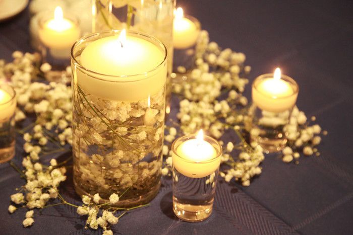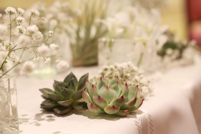 ナチュラルな雰囲気の多肉植物・エアプランツに、優しい雰囲気のかすみ草をプラスしました。この素敵な装飾に温かみをプラスする、キャンドルを使った演出も大好評だったそうです♡