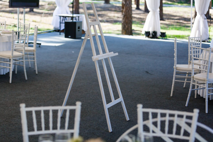 もし気にならなければ、挙式内で使わなかったアイテムもウェルカムスペースに飾って「式作りに参加してもらった」感じにするのも手。ウエルカムボード用のイーゼルをウェルカムスペースに2台立てたというお話もあります。